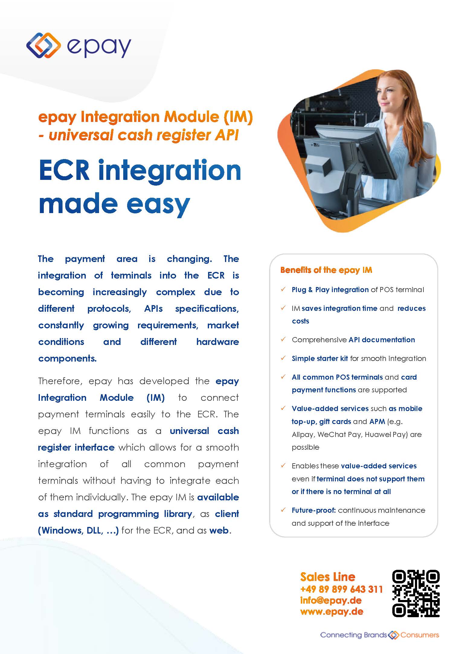 That’s why epay has developed the epay integration module (IM) to easily connect payment terminals to the cash register. The epay IM acts as a universal POS interface or driver and thus enables a fast connection of all common payment terminals without having to directly support the respective POS interfaces of the payment terminal. The epay IM does not require reintegration when changing POS.